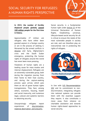 In 2022, the number of forcibly displaced people globally passed 100 million people for the first time in history. This two-page brief explains how social security can help to secure human rights for some of the most vulnerable people in society.
